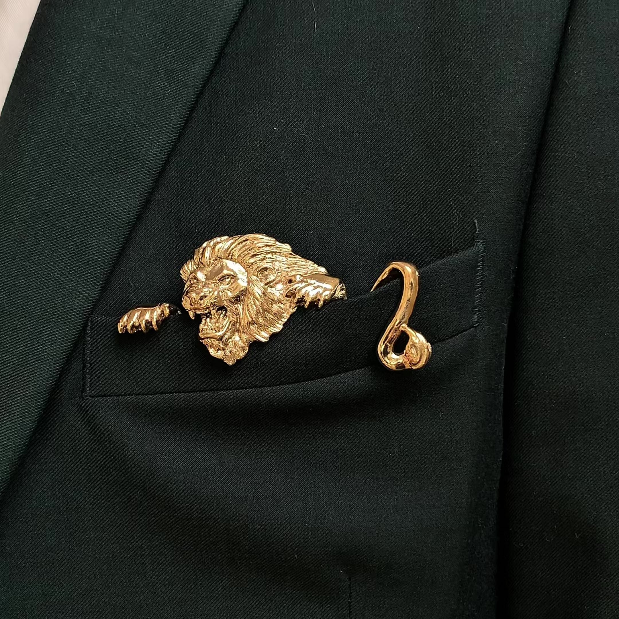 Discover the Gilded Lion Pocket Square™ — a bold and innovative accent for formalwear. This handcrafted bronze piece features a meticulously carved lion designed to command attention. The patented Pocket Square™ insert, created by Jose Balli, uses a magnetic mechanism and adjustable backing to fit securely in a variety of jacket pocket depths while standing upright.